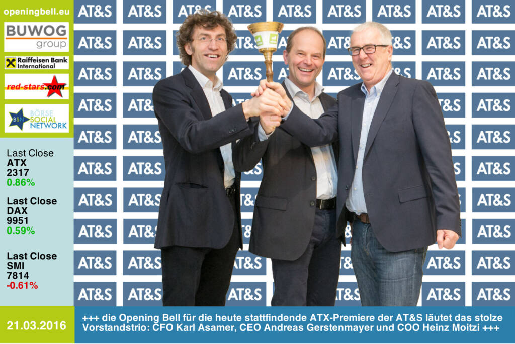 #openingbell am 21.3.: Die Opening Bell für die heute stattfindende ATX-Premiere der AT&S läutet das stolze Vorstandstrio: CFO Karl Asamer, CEO Andreas Gerstenmayer und COO Heinz Moitzi http://www.ats.net (21.03.2016)