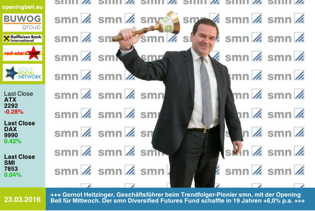 #openingbell am 23.3.: Gernot Heitzinger, Geschäftsführer beim Trendfolger-Pionier smn, mit der Opening Bell für Mittwoch. Der smn Diversified Futures Fund schaffte in 19 Jahren +8,0% p.a. http://www.smn.at http://www.openingbell.eu (23.03.2016)
