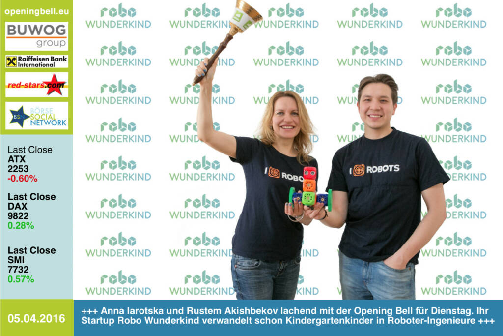 #openingbell am 5.4.: Anna Iarotska und Rustem Akishbekov lachend mit der Opening Bell für Dienstag. Ihr Startup Robo Wunderkind verwandelt schon Kindergartenkinder in Roboter-Ingenieure http://www.startrobo.com http://www.openingbell.eu (05.04.2016)