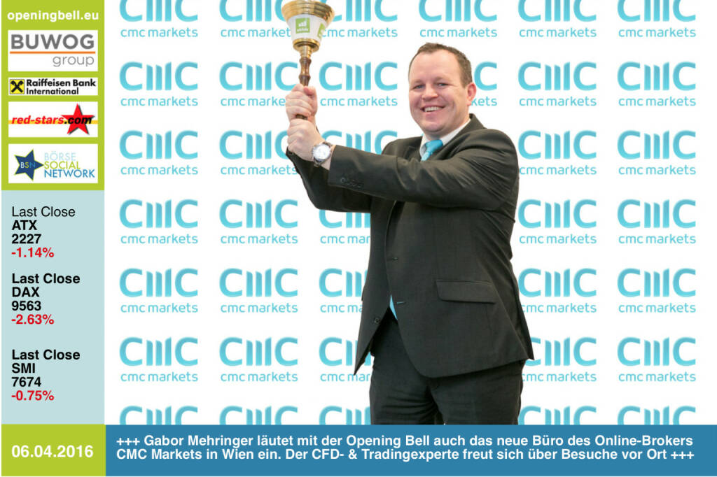 #openingbell am 6.4.: Gabor Mehringer läutet mit der Opening Bell für Mittwoch auch das neue Büro des Online-Brokers CMC Markets in Wien ein. Der CFD- & Tradingexperte freut sich über Besuche vor Ort in der Millennium City www.cmcmarkets.at http://www.openingbell.eu (06.04.2016)