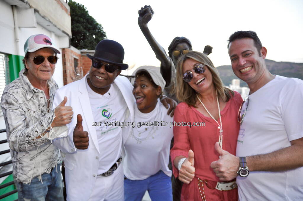 UIli Lommel (Regisseur), Tito Jackson (Sänger und Mitglied der "Jackson 5"), Mart'nalia (Sängerin, Brasilien), Christiane & Christian Hirmer (Unternehmer und Bauherren des campo bahia) : Tito Jackson dreht musikalische Antwort auf Michael Jacksons Kult-Video "They don´t care about us" in den Favelas von Rio : Fotocredit: Campo Bahia/Meier, © Aussendung (17.05.2016)