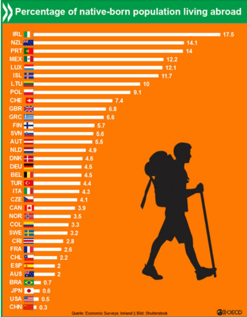 17,5 Prozent der gebürtigen Iren leben im Ausland. Der Anteil der Deutschen, die sich entschieden haben auszuwandern, liegt bei 4,5 Prozent.