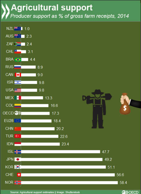 Die Schweiz und Norwegen sind die Länder, in denen Agrarbetriebe den größten Teil ihrer Einkünfte aus staatlichen Maßnahmen beziehen.