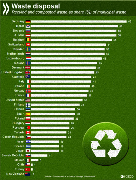 Während in Deutschland 65% der Siedlungsabfälle wiederverwertet werden, landet in Neuseeland alles auf der Mülldeponie. Mehr Informationen über z.B. Verbrennung mit Energierückgewinnung auf: http://bit.ly/1T0aSLw, © OECD (26.02.2016)