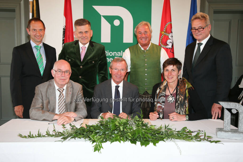 Wolfgang Urban (Nationalpark Direktor), Wilfried Holtmann (Vorsitzender VNP), Johann Bründl (Notar), Wilfried Haslauer (LH Sbg.), Peter Nindl (Bgm. Neukirchen), Astrid Rössler (LH-Stv. Sbg.), Mathias Zimmermann (GF VNP) : Historischer Grundankauf im Kerngebiet des Nationalparks : Land übernimmt 3.000 Hektar Fläche in den Hohen Tauern : Fotocredit: Landesmedienzentrum Salzburg(Neumayr/SB, © Aussender (17.06.2016)