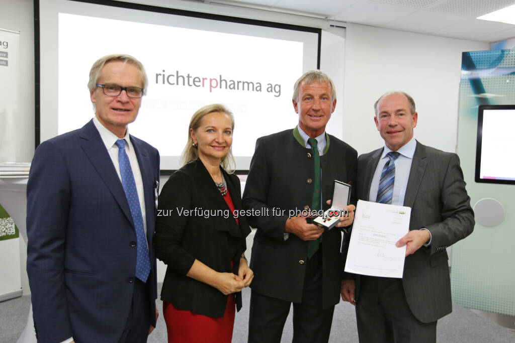 Clemens Malina-Altzinger (Vizepräsident WKO OÖ), Ulrike Rabmer-Koller (Vizepräsidentin WKO), Florian Fritsch (Eigentümer Richter Pharma AG), Max Hiegelsberger (Landesrat OÖ) : Richter Pharma AG feiert 100-jähriges Bestehen : Goldenes Ehrenzeichen des Landes Oberösterreich für Florian Fritsch : Fotocredit: Richter Pharma AG/APA-Fotoservice/Hartl, © Aussendung (06.10.2016)