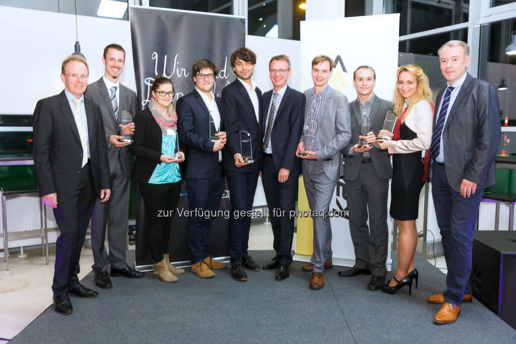 Die SiegerInnen des Kapsch Awards 2016 mit Rudolf Bernscherer, Personalleiter bei Kapsch (Mitte), Fritz Schmöllebeck, Rektor der FH Technikum Wien (links) und Thomas Faast, Public Affairs FH Technikum Wien (rechts): Kapsch AG: Kapsch Award für die besten Masterthesen von der FH Technikum Wien (C) © FH Technikum Wien – Thomas Lerch Photography