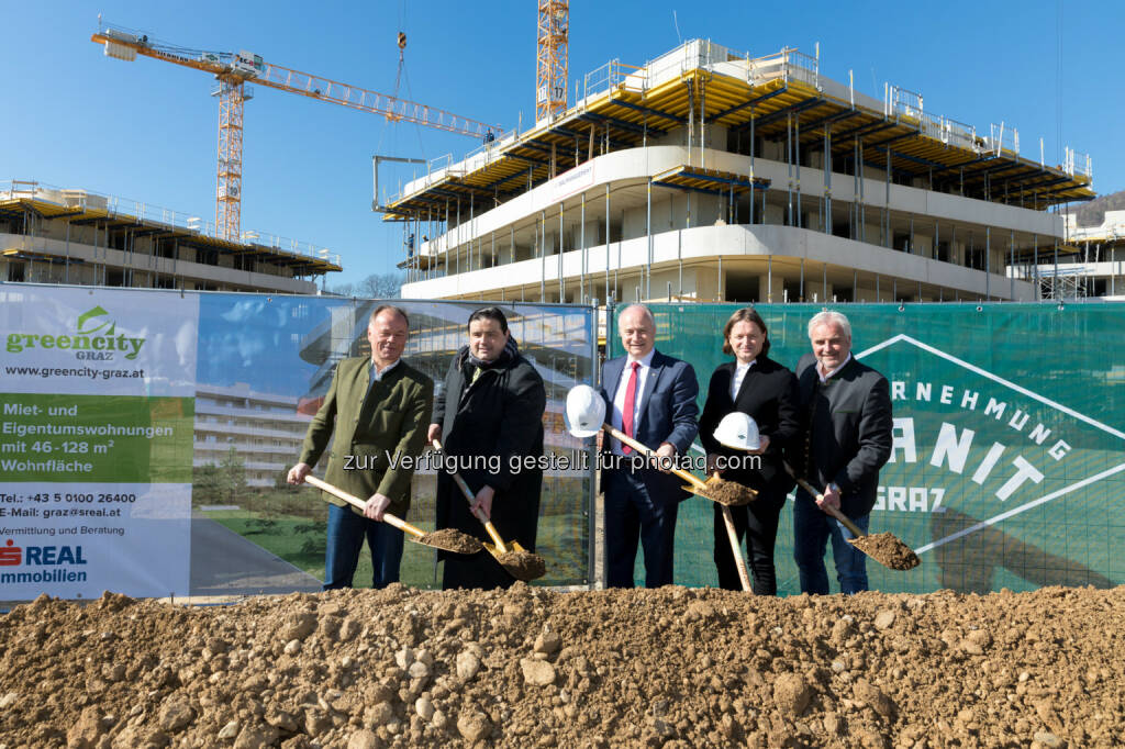 Gemeinderat Dr. Peter Piffl-Percevic, Geschäftsführer Ing. Alexander Schmidt (IVG Immobilienverwaltung GmbH), Landesrat Ök.-Rat Johann Seitinger, Geschäftsführer Günther Lederhaas (GRANIT), Bmst. Ing. Gerald Rumpl (GRANIT) - IVG Immobilienverwaltung GmbH: Spatenstich für die Greencity Graz in Straßgang (Fotograf: Harry Schiffer / Fotocredit: IVG Immobilienverwaltung GmbH), © Aussender (27.03.2017)