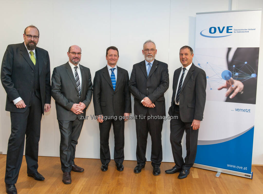 Dipl.-Ing. Christian Gabriel (Leiter Bereich Normung im OVE), Dipl.-Ing. Franz Ziegelwanger (Leiter der Abteilung Technik der Sektion Innovation und Telekommunikation im BMVIT), Luis Jorge Romero (ETSI-Generaldirektor), Dipl.-Ing. Richard Valenta (Referat IKT im OEK/OVE), Ing. Werner Fischer (Präsident Österr. Nationalkomitee von IEC und CENELEC) - Österreichischer Verband für Elektrotechnik OVE: Europäische Telekommunikationsnormung zu Gast in Wien (Fotocredit: OVE/Ing. Martin Steiner), © Aussender (12.04.2017)