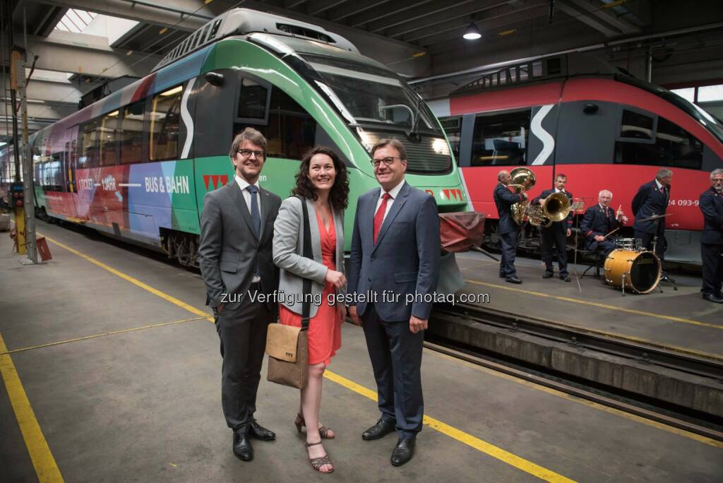 VVT Geschäftsführer Alexander Jug, LHSTV.in Ingrid Felipe und Landeshauptmann Günther Platter schicken einen Nahverkehrs-Zug zur Bewerbung des neuen Tiroltickets auf die Reise. - VVT - Verkehrsverbund Tirol: Bunte Zuggarnitur wirbt für Tirolticket (Fotograf: Gabriele Griessenboeck / Fotocredit: VVT), © Aussender (30.05.2017)