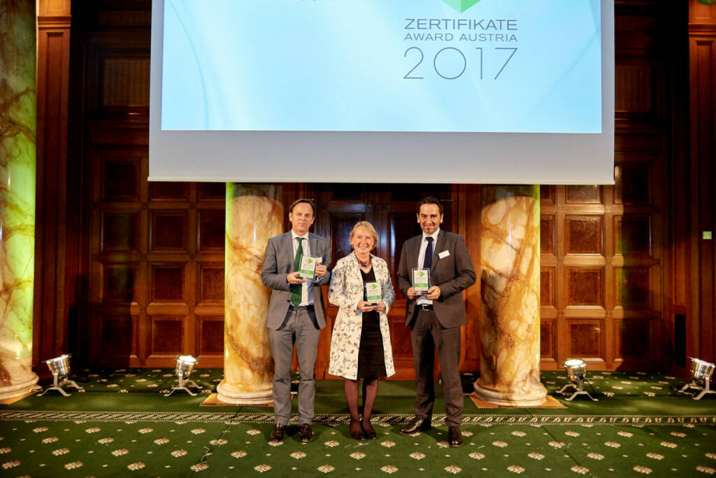 Gesamtsiegerbild - Volker Meinel ( BNP Paribas), Heike Arbter (RCB), Uwe Kolar ( Erste Group) - Zertifikate Award Austria 2017 (Fotocredit: Zertifikate Forum Austria), © Zertifikate Forum Austria (19.05.2017)