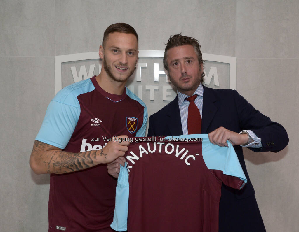 Mag. Franz Pranter mit Marko Arnautovic nach dem Signing bei West Ham. - NEXT MARKETING SERVICE KG: NEXT SPORTS MARKETING begleiten Rekord-Transfer von Marko Arnautovic (Fotocredit: Griffiths Photographers), © Aussendung (03.08.2017)