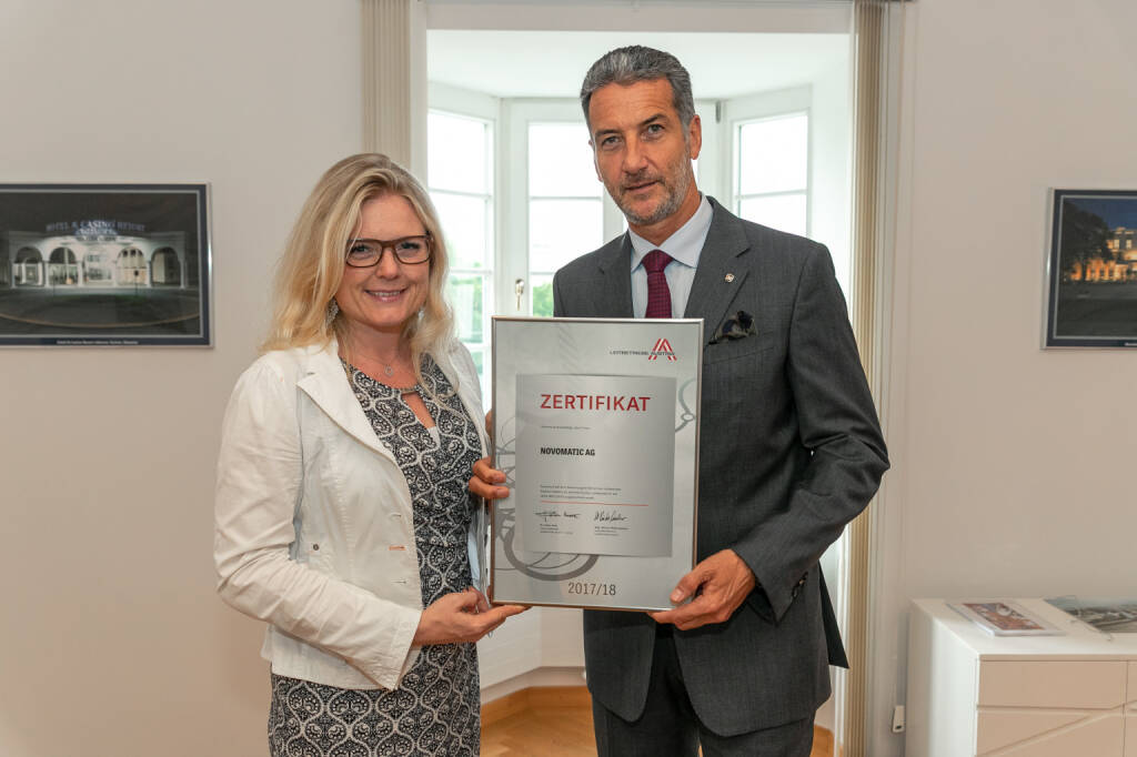 Novomatic als Leitbetrieb zertifiziert: v.l.n.r. Monica Rintersbacher (GF Leitbetriebe Austria), Harald Neumann (Vorstandsvorsitzender Novomatic); Copyright: Alexander Felten , © Aussendung (12.06.2018)