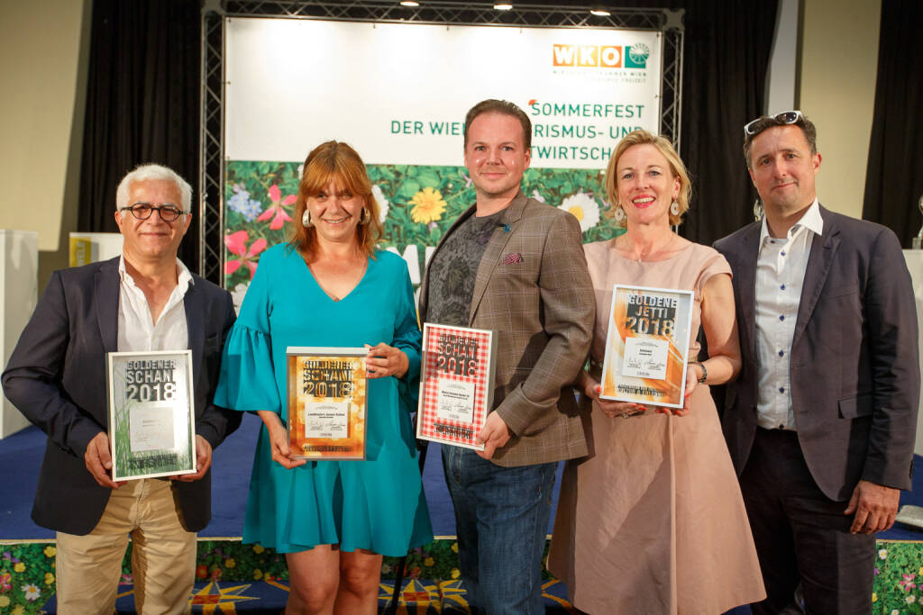 Verleihung der WK-Wien-Branchenpreise „Goldener Schani“ und „Goldene Jetti“: Tourismus-Spartenobmann Markus Grießler (re.) mit den Siegern: Manameierei - Landtmanns Jausen Station - Marco Simonis - Artissimi. Fotocredit:WK Wien/Florian Wieser, © Aussendung (20.06.2018)