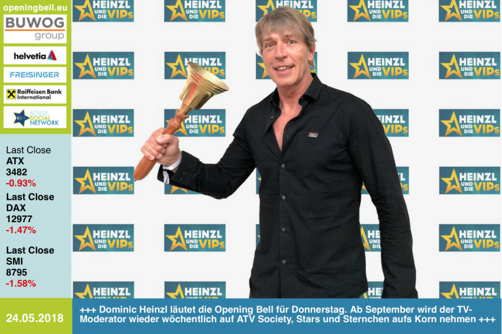 24.5.: Dominic Heinzl läutet die Opening Bell für Donnerstag. Ab September wird der TV-Moderator auf ATV wieder wöchentlich Society, Stars und Sternchen aufs Korn nehmen https://atv.at https://www.facebook.com/groups/GeldanlageNetwork/ #goboersewien (24.05.2018)