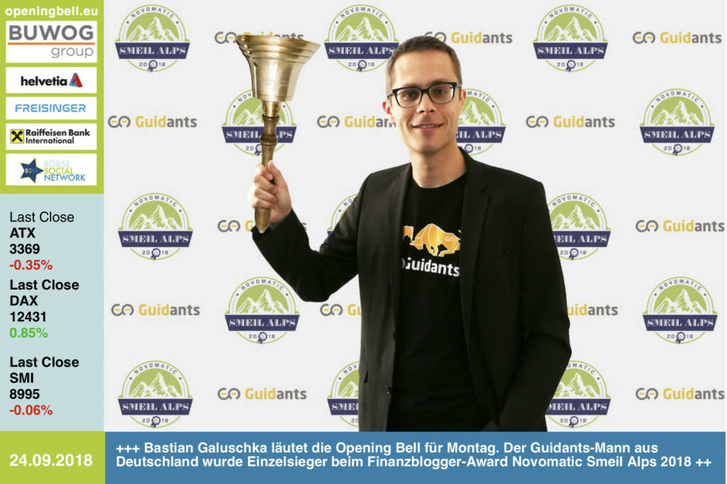 24.9.: Bastian Galuschka läutet die Opening Bell für Montag. Der Guidants-Mann aus Deutschland wurde Einzelsieger beim Finanzblogger-Award Novomatic Smeil Alps 2018 http://go.guidants.com/#c/bastian_galuschka http://www.smeil-award.com https://www.facebook.com/groups/GeldanlageNetwork (24.09.2018)