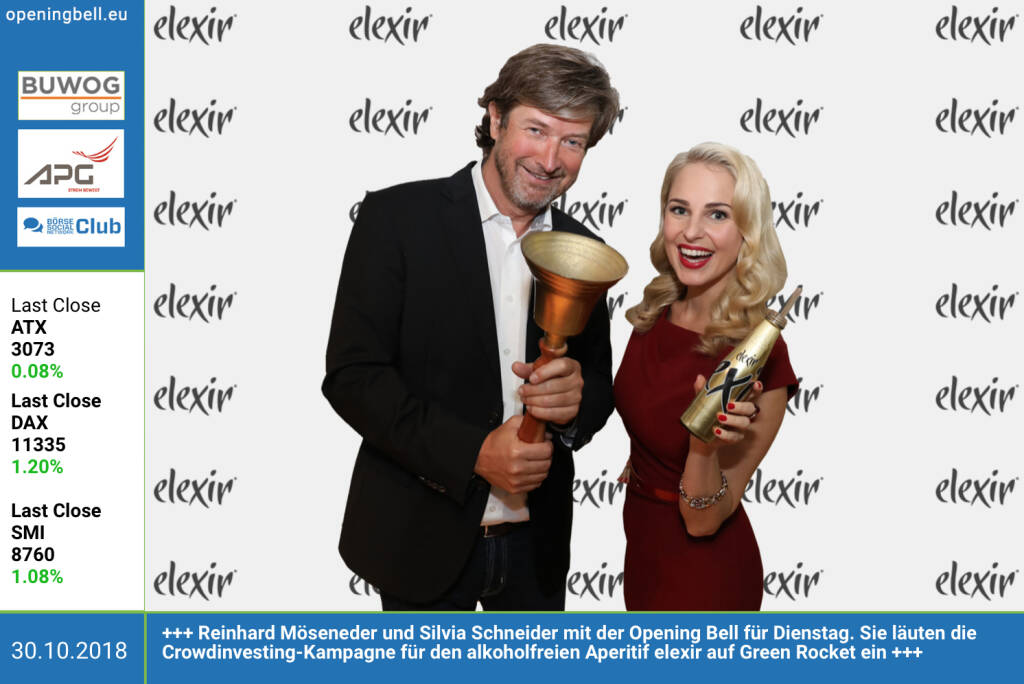 30.10.: Reinhard Möseneder und Silvia Schneider mit der Opening Bell für Dienstag. Sie läuten die Crowdinvesting-Kampagne für den alkoholfreien Aperitif elexir auf Green Rocket ein. https://www.greenrocket.com https://www.facebook.com/groups/GeldanlageNetwork (30.10.2018)