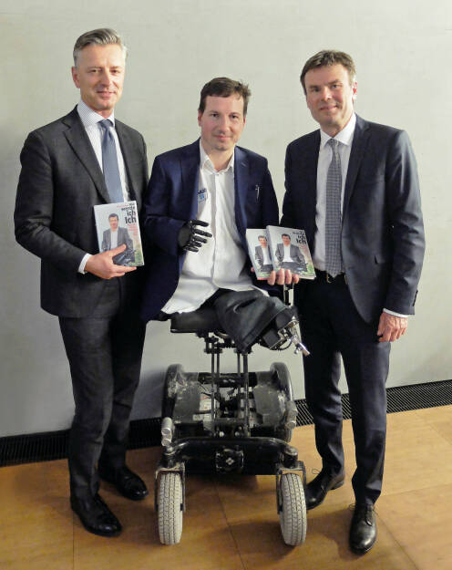 Der Psychologe, Motivationsredner und Autor Georg Fraberger (M.) präsentierte sein neues Buch auf Einladung des Bankhaus Spängler in Linz. Vor den beeindruckten Gästen erzählte der Wiener, der ohne Arme und Beine geborene wurde, wie man auch mit einer schweren körperlichen Behinderung ein ausgeglichenes Leben führen kann. Zugleich präsentierte er sein neues Buch mit dem Titel “Wie werde ich Ich - Zwischen Körper, Verstand und Herz”. Vorstandssprecher Werner Zenz (l.) und Regionalleiter Johann Penzenstadler zeigten sich beeindruckt. Bildquelle: Bankhaus Spängler