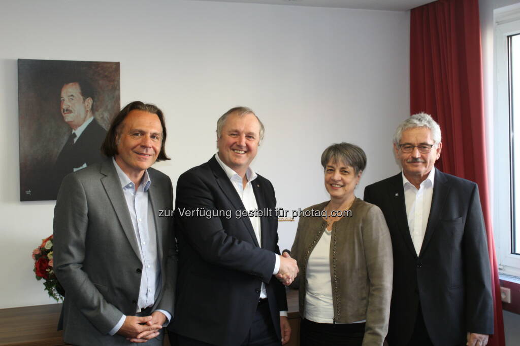 Die Swietelsky Bauges.m.b.H. mit Sitz in Linz/Oberösterreich übernimmt 100% an der Ing. Baierl GmbH im niederösterreichischen Steinakirchen am Forst. Personen:(v.l.n.r.): GF Engelbert Schwank, GF Dipl.-Ing. Karl Weidlinger, Brigitte Baierl, Erich Baierl; Fotocredit:Swietelsky, © Aussendung (08.10.2018)