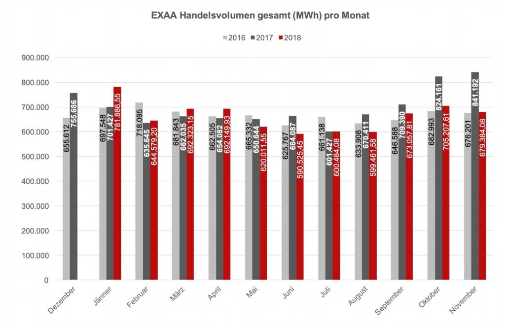 Im November 2018 konnte ein Gesamtvolumen, für die Liefergebiete Österreich und Deutschland zusammen, von insgesamt 679.384,1 MWh erzielt werden. Im Vergleich zum Vorjahresmonat (841.192,4 MWh) bedeutet dies einen Rückgang des gesamten Handelsvolumens von 19,3%. Am umsatzstärksten Liefertag (29. November) wurden 29.439,6 MWh auktioniert. In der Year-to-date Betrachtung bedeutet dies einen Rückgang des Gesamtumsatzes von 4,4% (Jänner - November 2018: 7279 GWh; Jänner - November 2017: 7615 GWh).