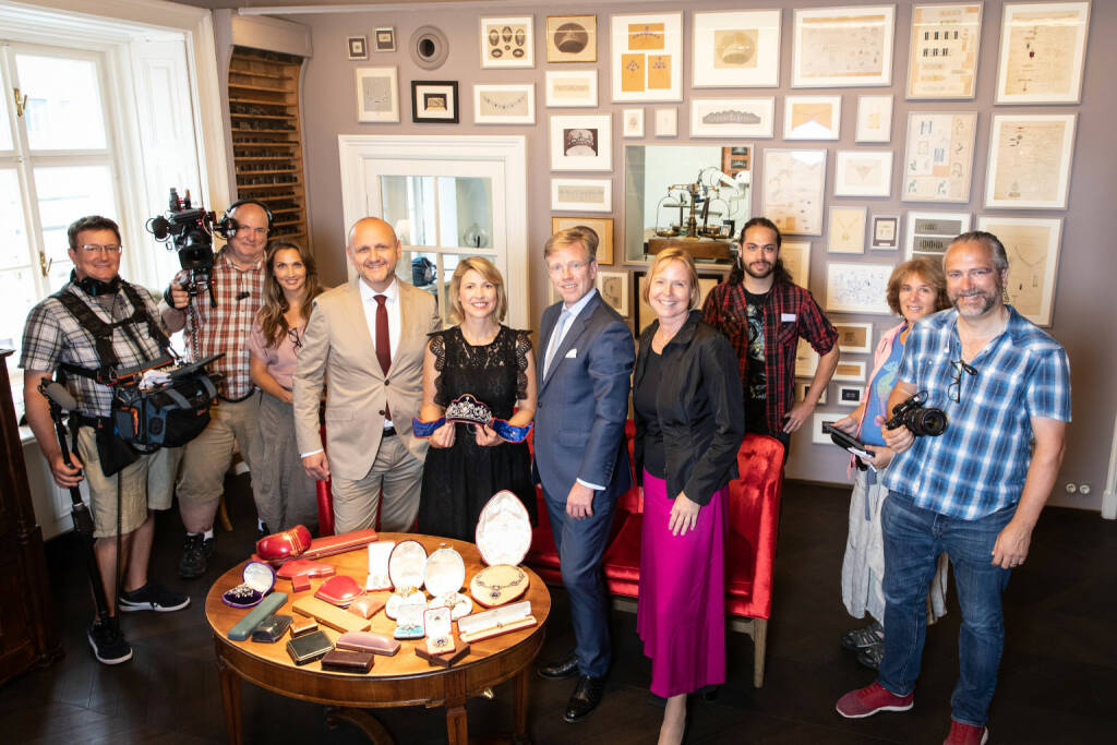 Österreich Werbung und WienTourismus holen derzeit erfolgreichste Reise-TV-Show ‚Samantha Brown’s Places to Love‘ nach Wien. WienTourismus-Direktor Norbert Kettner (4.v.l.) und Österreich Werbung Geschäftsführerin Petra Stolba (4.v.r.) besuchten Samantha Brown (5.v.l.) beim Dreh mit Christoph Köchert, Geschäftsführer der Juweliere A.E.Köchert GmbH (5.v.r.); Credit: Wien Tourismus/Rainer Fehringer, © Aussender (31.07.2019)
