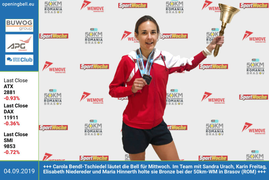 4.9.: Carola Bendl-Tschiedel läutet die Opening Bell für Mittwoch. Im Team mit Sandra Urach, Karin Freitag, Elisabeth Niedereder und Maria Hinnerth holte sie Team-Bronze für Österreich bei der 50km-WM in Brasov (ROM) http://brasov50km.com (Foto im Rahmen der des Wemove-Geburtstags ... ) (04.09.2019)