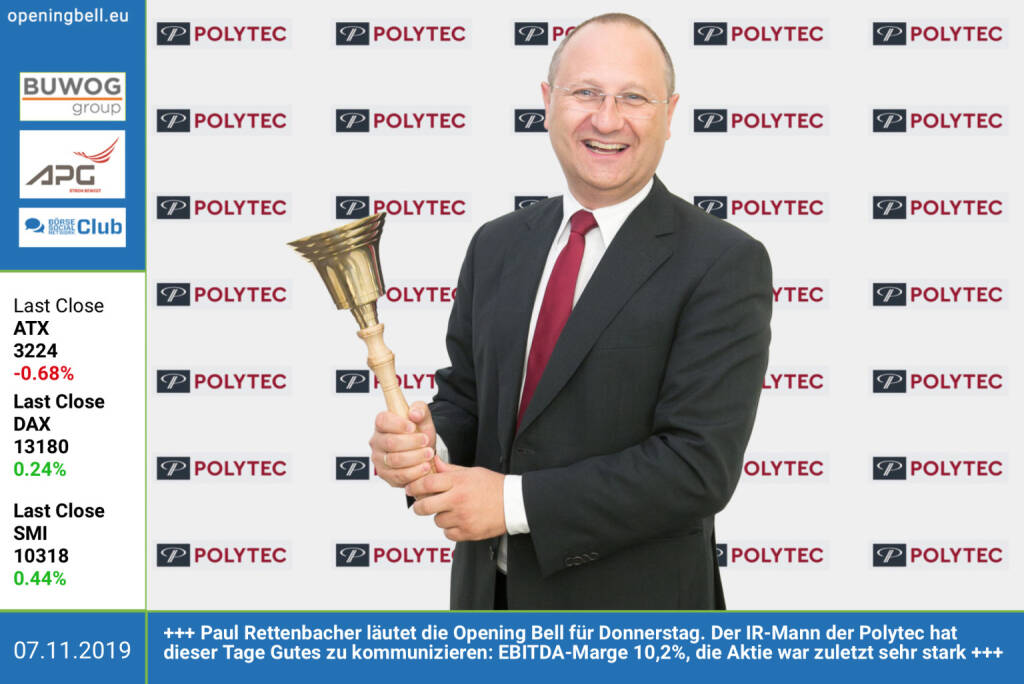 7.11.: Paul Rettenbacher läutet die Opening Bell für Donnerstag. Der IR-Mann der Polytec hat dieser Tage Gutes zu kommunizieren: EBITDA-Marge 10,2%, die Aktie war zuletzt sehr stark https://iaa.polytec-group.com http://www.boerse-social.com/polytec (07.11.2019)