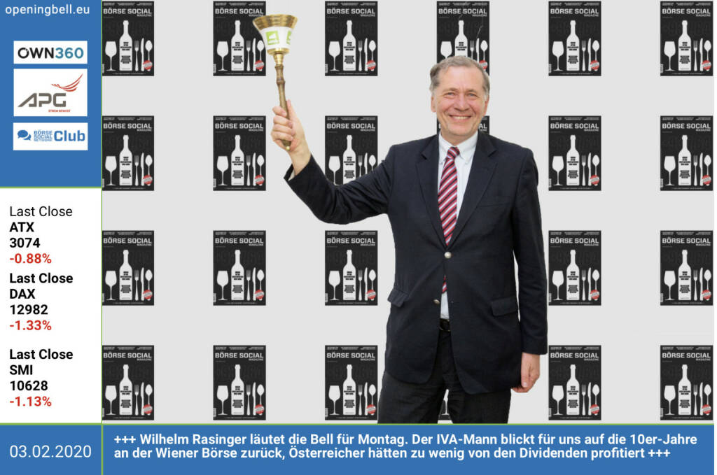 3.2.: Wilhelm Rasinger läutet die Opening Bell für Montag. Der IVA-Mann blickt für uns auf die 10er-Jahre an der Wiener Börse zurück, die österreichischen Anleger hätten zu wenig von den Dividenden profitiert. Mehr dazu heute Mittag im #gabb http://www.boerse-social.com/gabb