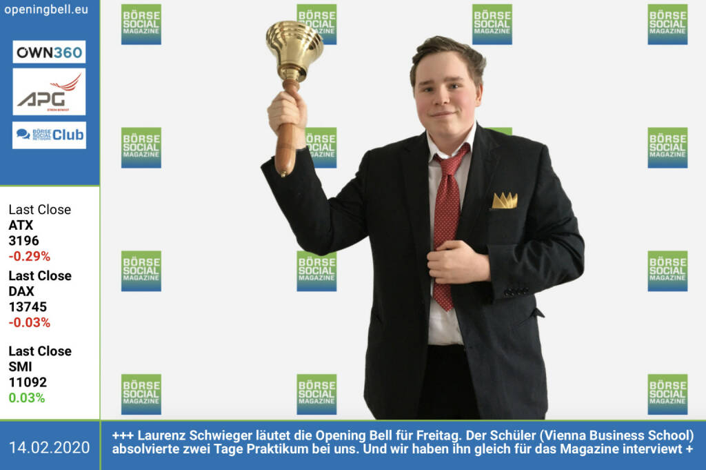 14.2.: Laurenz Schwieger läutet die Opening Bell für Freitag. Der Schüler (Vienna Business School) absolvierte zwei Tage Praktikum bei uns. Und wir haben ihn gleich für das Magazine interviewt http://www.boerse-social.com/magazine (14.02.2020)