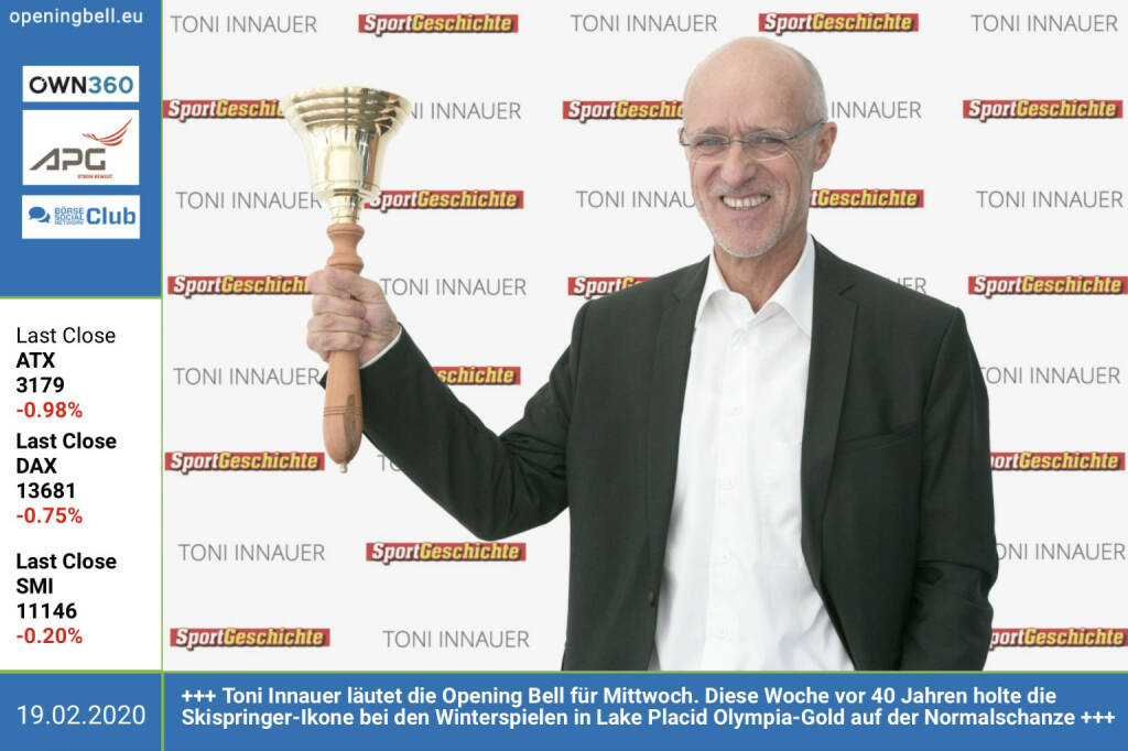 19.2.: Toni Innauer läutet die Opening Bell für Mittwoch. Diese Woche vor 40 Jahren holte die Skispringer-Ikone bei den Winterspielen in Lake Placid Olympia- Gold auf der Normalschanze http://www.toni-innauer.at http://www.sportgeschichte.at