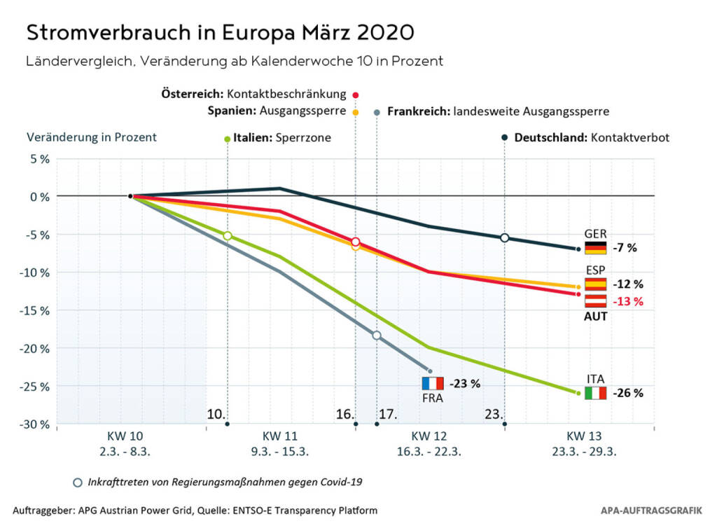 Austrian Power Grid: Maximale Transportkapazität für maximale Stromsicherheit in Europa; Stromverbrauch März 2020: Die Grafik zeigt, wie sich die Corona-Maßnahmen auf den Stromverbrauch in Europa ausgewirkt haben. Fotocredit: APG/ENTSO-E, © Aussender (06.04.2020)