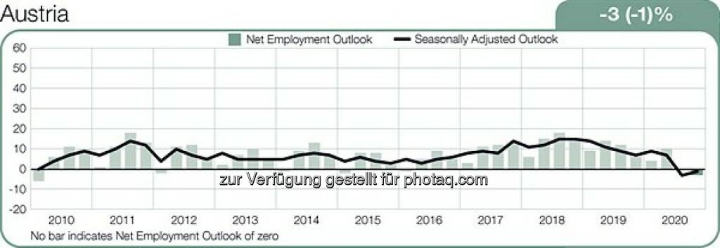 ManpowerGroup Umfrage zum Beschäftigungsausblick Q4 2020: Die österreichischen Arbeitgeber erwarten im vierten Quartal 2020 einen gedämpften Arbeitsmarkt und melden einen Nettobeschäftigungsausblick von -1%. Die Einstellungspläne sind im Vergleich zum 3. Quartal 2020 um 2 Prozentpunkte stärker, aber im Jahresvergleich um 8 Prozentpunkte schwächer. Credit: Manpower, © Aussender (09.09.2020)