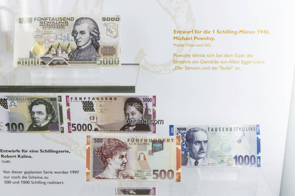 5.000-Schilling-Note aus dem Jahr 1988, Wolfgang Amadeus Mozart, 500- , Rosa Mayreder, und 1.000-Schilling-Note, Karl Landsteiner, aus dem Jahr 1997, © finanzmarktfoto.at/Martina Draper (15.04.2013)