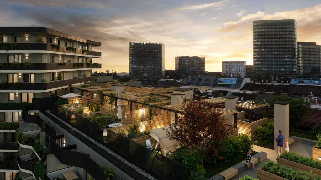Buwog baut: „Deck10“ bietet u.a. ein Co-Working-Space und eine Dachterrasse mit Yoga-Bereich, Fitness-Zone, Urban-Gardening-Flächen und Photovoltaikanlage.
