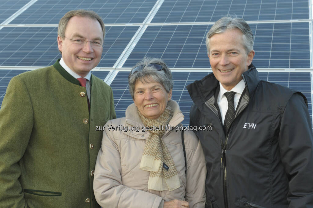 Sonnenenergie-Bürgerbeteiligung: NÖ-Energie-Landesrat Stephan Pernkopf und EVN Vorstandssprecher Peter Layr mit Eva Fischer aus Wiener Neustadt, die sich letztes Jahr am Sonnenkraftwerk Zwentendorf beteiligte. Ab 4.5. Anteile des neuen Sonnenkraftwerkes mit Bürgerbeteiligung von EVN und Land NÖ erhältlich ... (c) EVN / Gabriele Moser (03.05.2013)