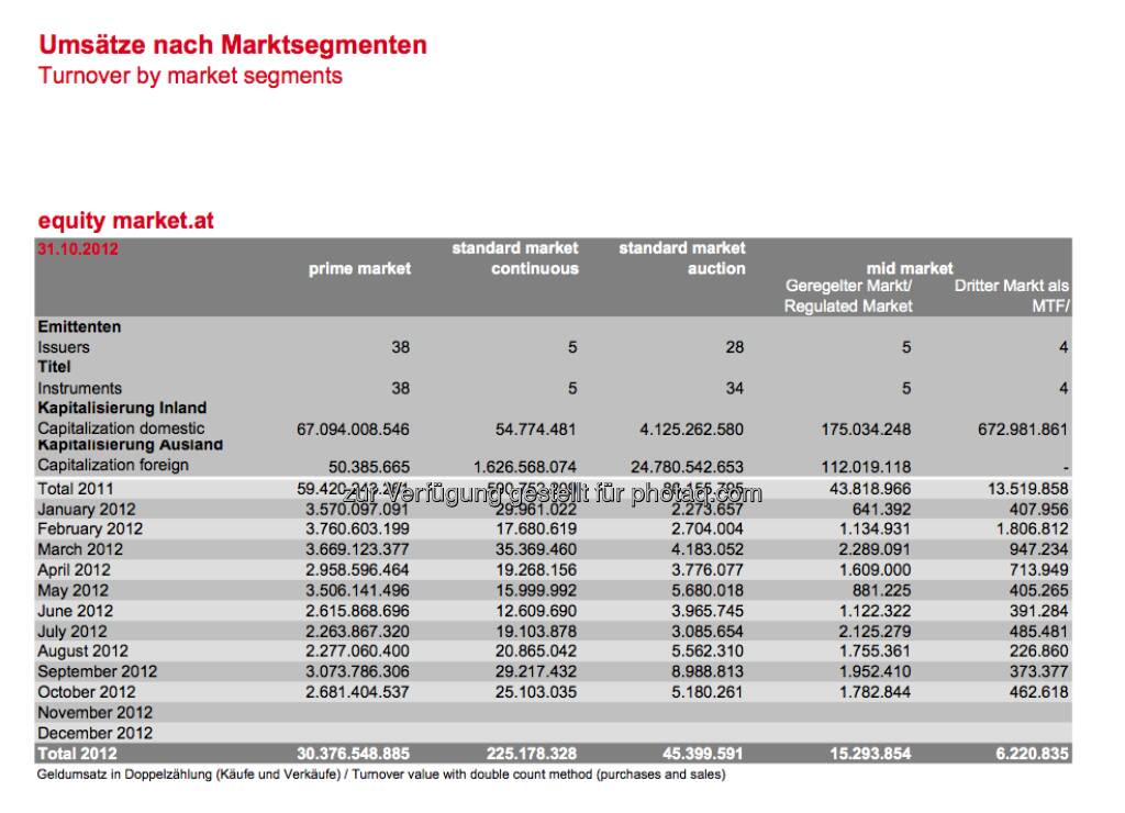 Wiener Börse: Monatsumsätze nach Marktsegmenten per 31.10. (c) Wiener Börse (15.12.2012)