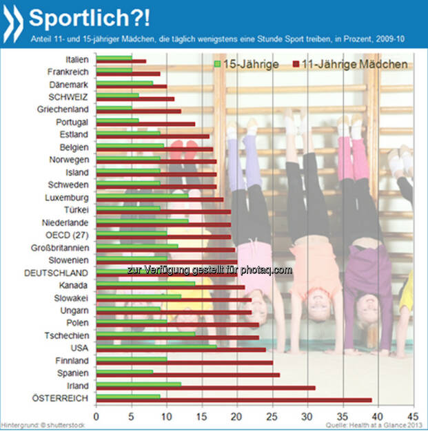 Alterslahm? In der OECD sind 11-Jährige um einiges sportlicher als 15-Jährige. In Deutschland beispielsweise treiben unter den jüngeren Mädchen gut 20 Prozent täglich Sport, während sich ihre älteren Geschlechtsgenossinnen gerade noch zu neun Prozent so oft bewegen.