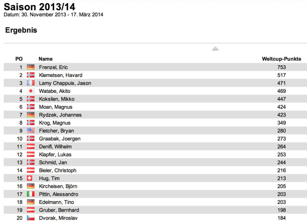 Nordische Kombination Weltcup Herren nach 8 Bewerben: In Tschaikowski II gewann unter Abwesenheit der Topleute Wilhelm Denifl (1. Welcupsieg) vor Björn Kircheisen und Miroslav Dvorak. Die Führung behauptete Eric Frenzel vor Akito Watabe und Lamy Chappuis, alle drei nicht am Start., © laola1.at (06.01.2014)