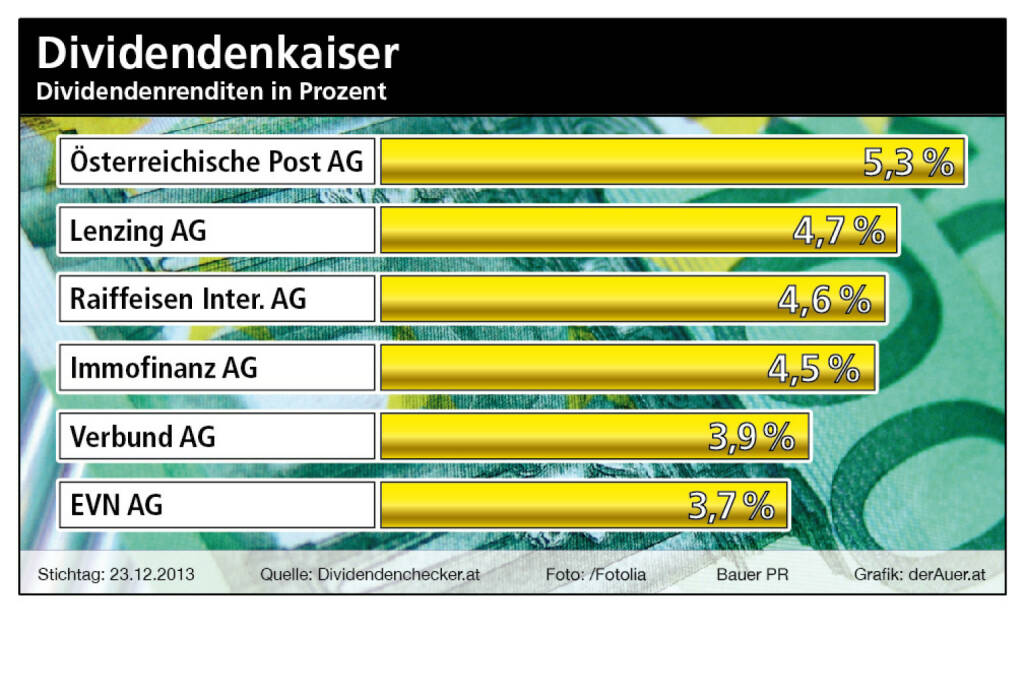 Dividendenkaiser Österreich: Post, Lenzing, RBI, Immofinanz, Verbund, EVN (c) Bauer PR, derAuer.at (07.01.2014)