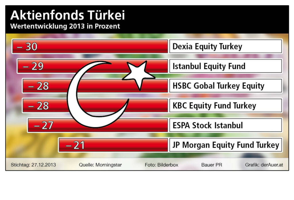 Aktienfonds Türkei 2013: Dexia Equity Turkey, Istanbul Equity Fund, HSBC Global Turkey Equity, KBC Equity Fund Turkey, ESPA Stock Istanbul, JP Morgan Equity Fund Turkey (c) Bauer PR, derAuer.at (11.01.2014)