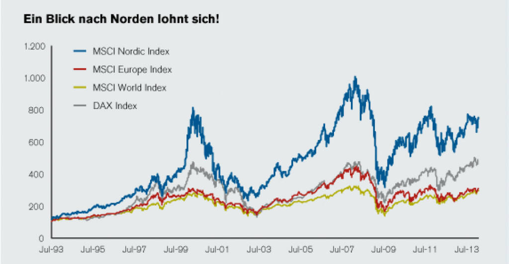 Nordea - ein Blick nach Norden lohnt sich . Quelle: Datastream. Stand: 31.07.2013. Auf Monatsbasis in USD. Beobachteter Zeitraum: 01.08.1993 – 31.07.2013. Die dargestellte Wertentwicklung ist historisch; Wertentwicklungen in der Vergangenheit sind kein verlässlicher Richtwert für zukünftige Erträge.