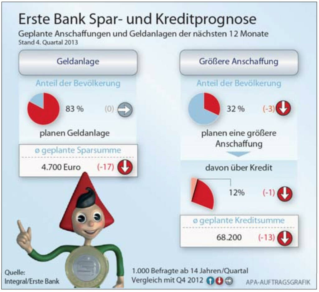 Erste Bank Spar- und Kreditprognose: Die ÖsterreicherInnen geben an, im Jahr 2014 rund 4.700 Euro wieder- bzw. neuveranlagen zu wollen. In den kommenden 12 Monaten sind das exakt 1.000 Euro weniger als im Vergleichszeitraum des Vorjahres. Rund ein Drittel (32%) sieht sich im gleichen Zeitraum mit größeren Anschaffungen konfrontiert und 12% derer, werden das auch mittels Kredit finanzieren. Als die besten Veranlagungsformen für einen langfris- tigen Vermögensaufbau sehen die ÖsterreicherInnen den Bausparer, das Sparbuch sowie Immobilien. Wertpapiere nehmen erst die Plätze vier bis sechs ein. Das ergab der aktuelle Spar- und Kreditmonitor, eine quartalsweise Integral-Umfrage im Auftrag von Erste Bank und Sparkassen. (20.01.2014)