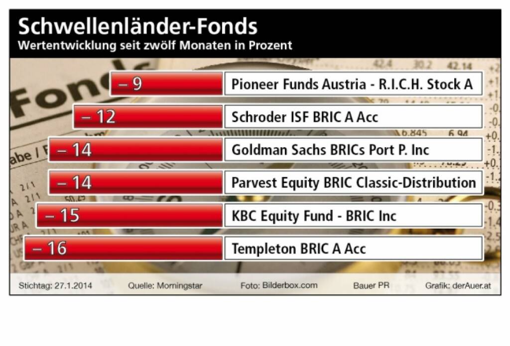 Schwellenländer-Fonds, Wertzuwachs seit zwölf Monaten in Prozent. Pioneer, Schroder, Goldman, Parvest, KBC, Templeton (c) Bauer PR, derAuer.at (01.02.2014)