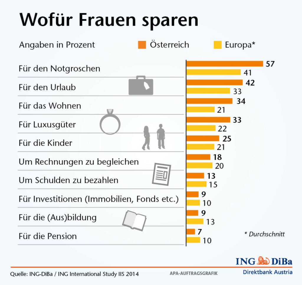 Wofür Frauen sparen - Notgroschen vor Urlaub und Wohnen, Pension weit abgeschlagen (Grafik: ING-DiBa) (06.03.2014)