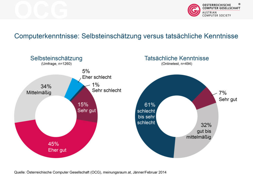 Laut einer Studie der Österreichischen Computer Gesellschaft OCG glauben 60 % der ÖsterreicherInnen, dass ihre Computerkenntnisse im Allgemeinen "sehr gut" oder "gut" sind. Beim Online-Test schneiden im Gegensatz dazu aber 61% "schlecht" bis "sehr schlecht" ab. (19.03.2014)