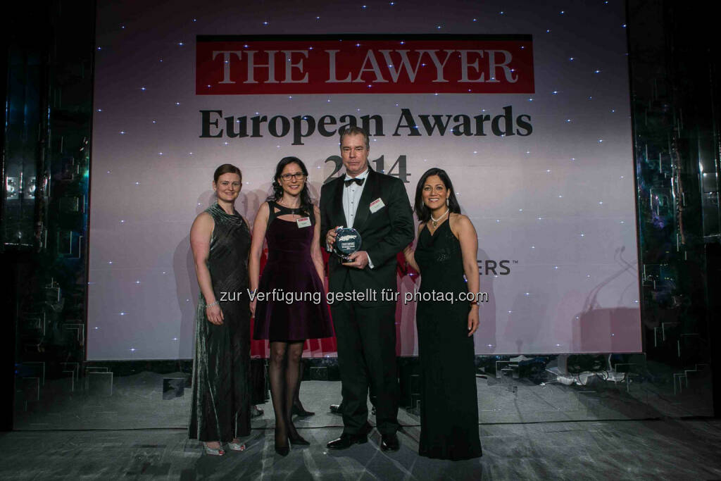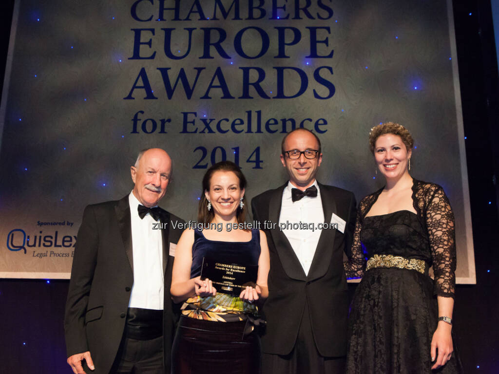 Schönherr gewinnt Chambers „Client Service Award“ für Österreich: Schönherr-Partner Ursula Rath (2.v.l.) und Christoph Haid (3.v.l.) begleitet von den Event Co-Hosts Alastair Sutton (Brick Court Chambers, London) und Georgia Brooks (Redakteurin von Chambers Europe) (Bild: Chambers and Partners), © Aussendung (27.04.2014)