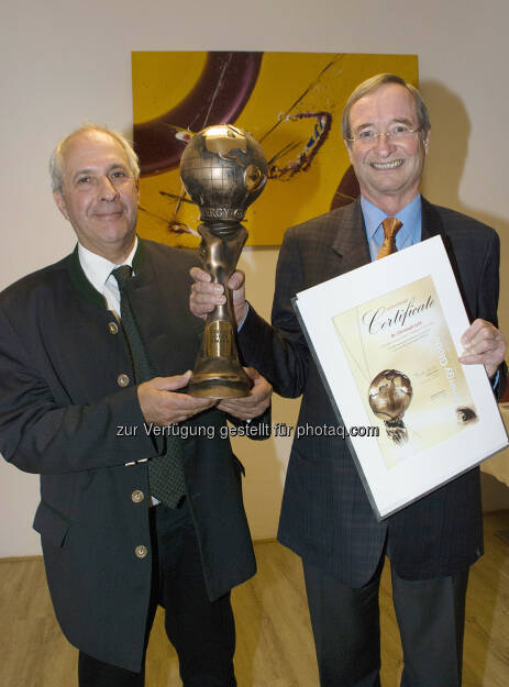 Wirtschaftsbund Oberösterreich: Energy Globe Award geht an Christoph Leitl - Energy-Globe-Gründer Wolfgang Neumann überreichte Präsident Christoph Leitl (v. l.) den Ehren-Globe höchstpersönlich (c) Engelsberger, © Aussendung (27.04.2014)