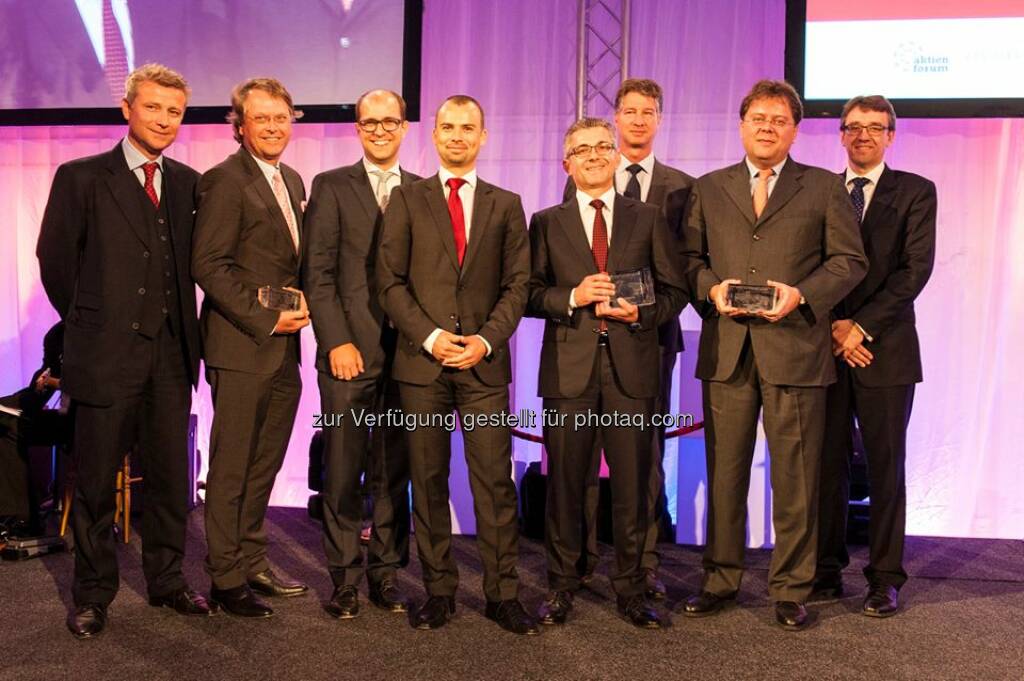Erstmalig verliehener Wiener Börse-Journalistenpreis geht an voestalpine - Wolfgang Nedomansky (APA-Finance), Hans Tschuden ( Telekom Austria), Peter Schiefer (Telekom Austria), Peter Felsbach (voestalpine), Herbert Eibensteiner (voestalpine), Michael Mauritz ( Erste Group), Gernot Mittendorfer (Erste Group), Harald Hagenauer (C.I.R.A.) (c) APA, © Aussendung (21.05.2014)