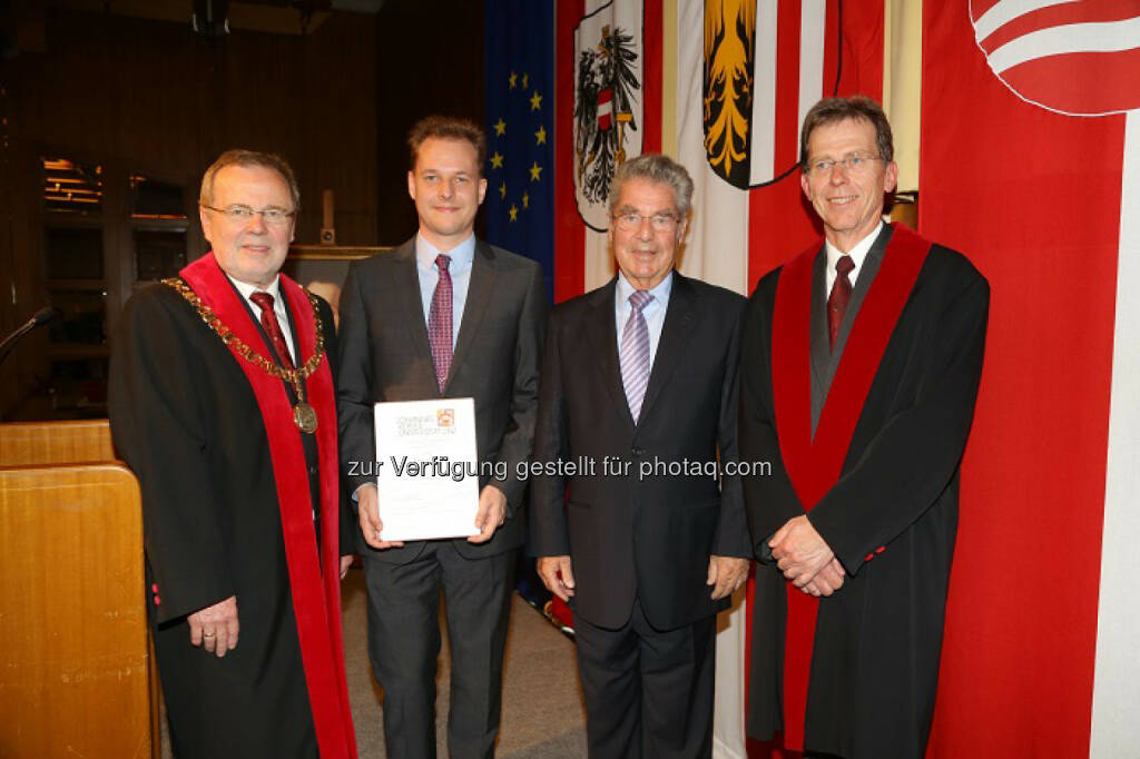 Rektor Hagelauer (Johannes Kepler Universität (JKU) Linz), Roland Schatz, Bundespräsident Heinz Fischer, Prof. Krotschek: Promovenden der Johannes Kepler Universität (JKU) Linz erhielten die Doktorwürde der Technischen Wissenschaften., © Aussendung (02.06.2014)