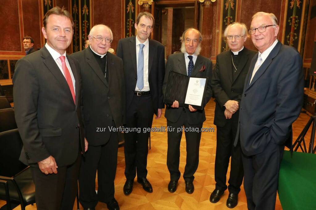 Verleihung der Kardinal-Opilio-Rossi-Medaille 2014 an Publizist Hans Winkler: Stv. ÖVP-Bundesparteiobmann Abg. Niki Berlakovich; Seine Exzellenz Peter Stephan Zurbriggen, Apostolischer Nuntius in Österreich, Rudolf Mitlöhner, Chefredakteur "Die Furche"; Preisträger Hans Winkler, Seine Exzellenz Diözesanbischof Egon Kapellari; Helmut Kukacka, Präsident der Arbeitsgemeinschaft Katholischer Verbände Österreichs (AKV), © Aussendung (12.06.2014)